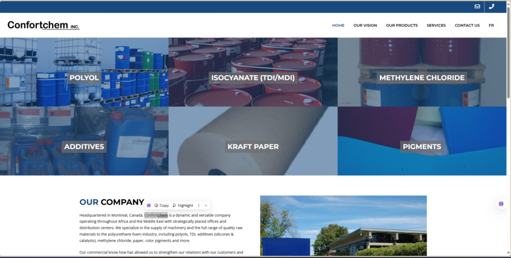 Specialty chemicals and rubber solutions website featuring multilingual content, modern navigation, and a responsive product catalog.